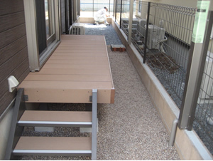 部屋から洗濯物が干せるようにウッドデッキを提案。テラスもつけてるので雨でも安心して洗濯ものも