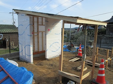 外構工事の前にまず息子さんの為の部屋と自転車置き場を作っていきます。お家の感じに合わせて片屋根のモダンな小屋ができる予定です。